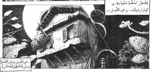 Fatma n'paraplui is entirely drawn and inked in black which suits the mood of a story told to spook and disturb. In each plate, the perspective changes and alternates. The reader can become a child looking up to grown ups and seeing them enormous, or part of a group of women looking down the street from balconies watching what they perceive as tiny cramped rooftops. Faces are enlarged and facial traits accentuated as if lighted by a lamp at night during halloween.